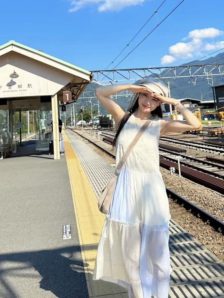 その後姿に誘われてつい駅まで追い続けてしまいましたが、電車の中では腋の方も、まるで見せつけるかのように丸出しにしてくれました。
