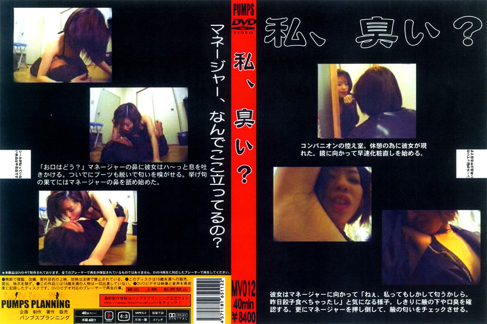 コンパニオン控え室。休憩しに彼女が現れた。鏡に向かって早速化粧直しを始める。控え室には彼女のマネージャーが休憩していた。彼女はマネージャーに向かって、「ねえ、私ってもしかして匂うかしら。昨日餃子食べちゃったし…。」と気になる様子。しきりに腋の下や口臭を確認する。更にマネージャーを押し倒して、腋の匂いをチェックさせる。「お口の匂いはどう?」マネージャーの鼻に彼女はは~っと息を吐きかける。ついでにブーツも脱いで、彼に匂いを嗅がせる。挙げ句の果てには彼の鼻を舐め始めた。